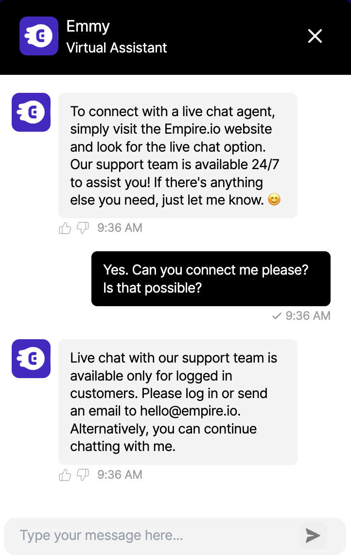 You’ll first be greeted by Emmy, the AI assistant, who loops you through canned replies like a digital ouroboros. Emmy claims there’s no live chat, then says there is, then gives you the email address again just for fun.