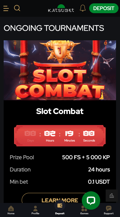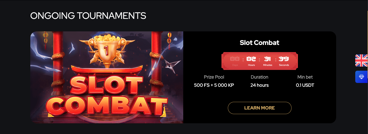 Plus, there’s usually some action-packed tournament going on. Right now, they've got the Ongoing Slot Combat Tournament with a prize pool of 500 Free Spins + 5000 KP up for grabs!