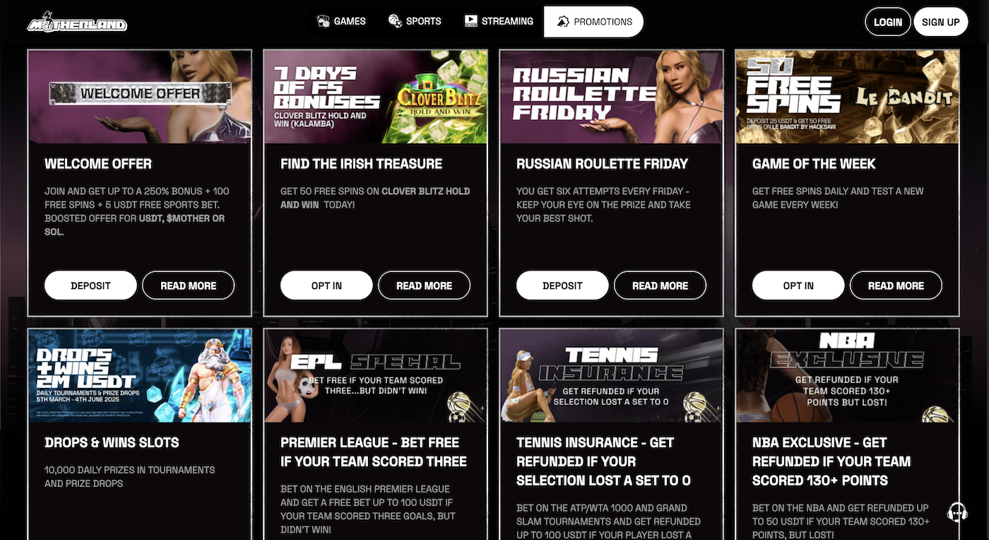 Mother.Land Casino has weekly offers, including crypto cashback, Bitcoin casino free spins, and sports betting promos.