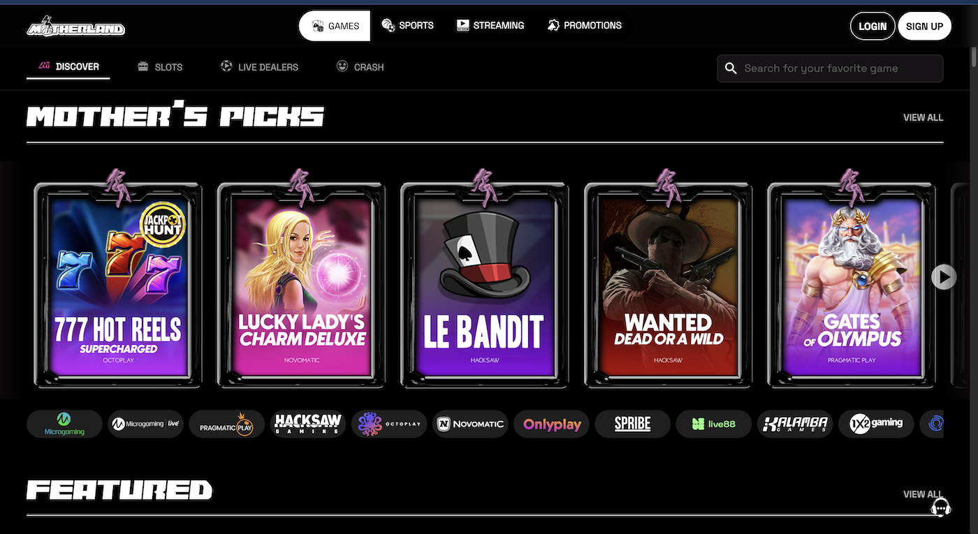 "Mother’s Picks" highlights featured slots, though I have no idea how they are selected. A mix of 777 Hot Reels, Wanted Dead or a Wild, and a shotgun-wielding duck for NoLimit City’s Duck Hunters gives me the vibe that Mother.Land is curating games purely based on vibes.