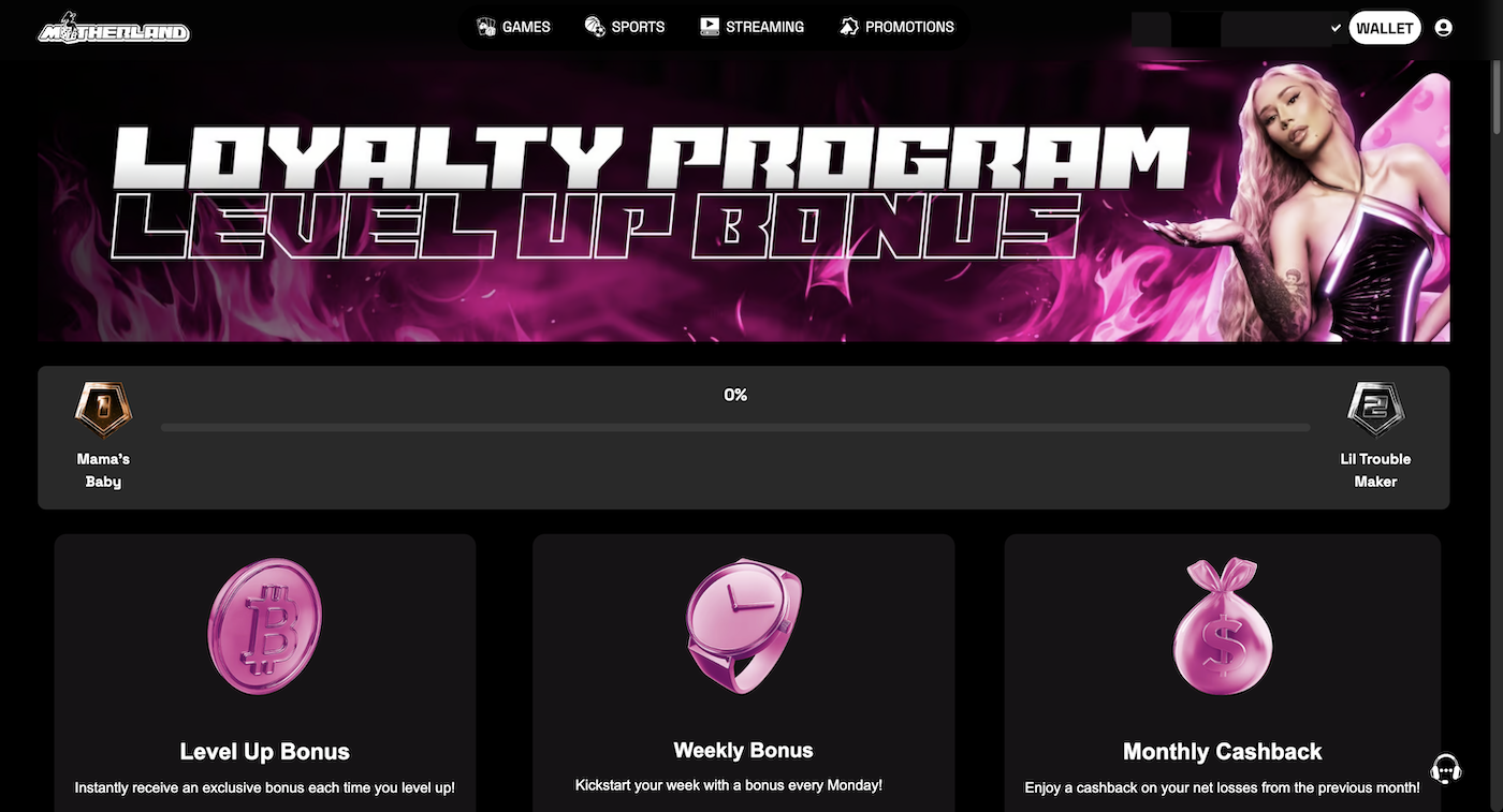 Mother.Land technically has a loyalty program, but you wouldn’t know it unless you go digging. Instead of being proudly advertised, it’s hidden inside your profile like some kind of VIP Easter egg. The system is XP-based, rewarding you with level-up bonuses, weekly bonuses, and monthly cashback.