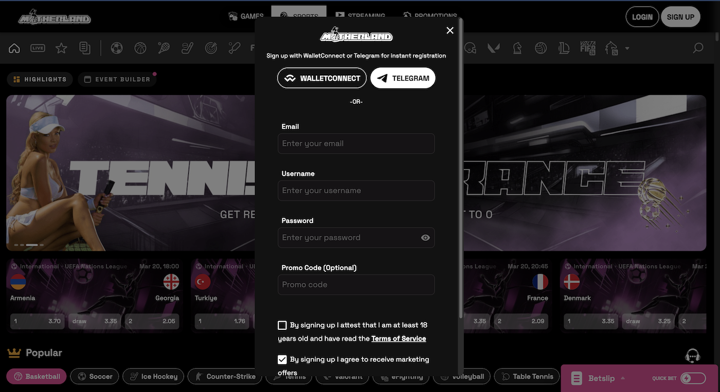Mother.Land lets you skip the long forms and sign up in a few clicks. You can register using WalletConnect or Telegram, making your crypto wallet or Telegram profile your casino login. No email, no phone number, no personal details. Or, if you’re like me and prefer a traditional account, you can enter an email, username, and password, but that’s as deep as it goes. As for KYC, the casino reserves the right to ask for photo ID, proof of address, or even a verification call before withdrawals, but this isn’t automatic. It’s likely only required for larger cash-outs or if they flag something suspicious. So, compared to casinos that enforce mandatory KYC on first withdrawal, Mother.Land gives you some breathing room.