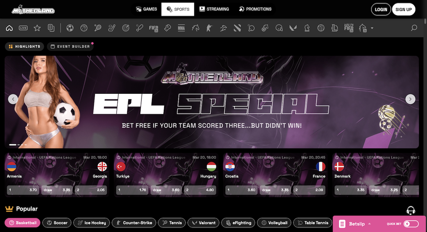 Mother.Land Casino covers just under 50 sports and esports, meaning you can bet on everything from Premier League football to niche esports tournaments.