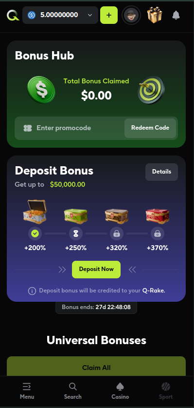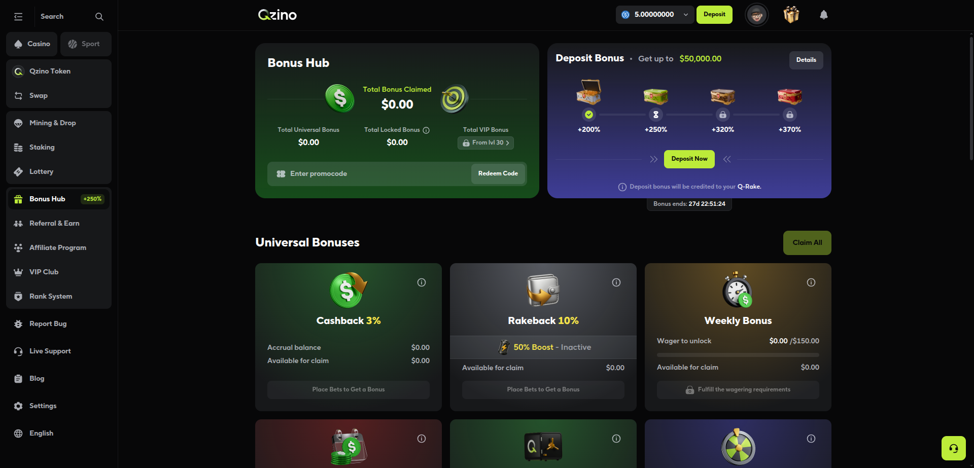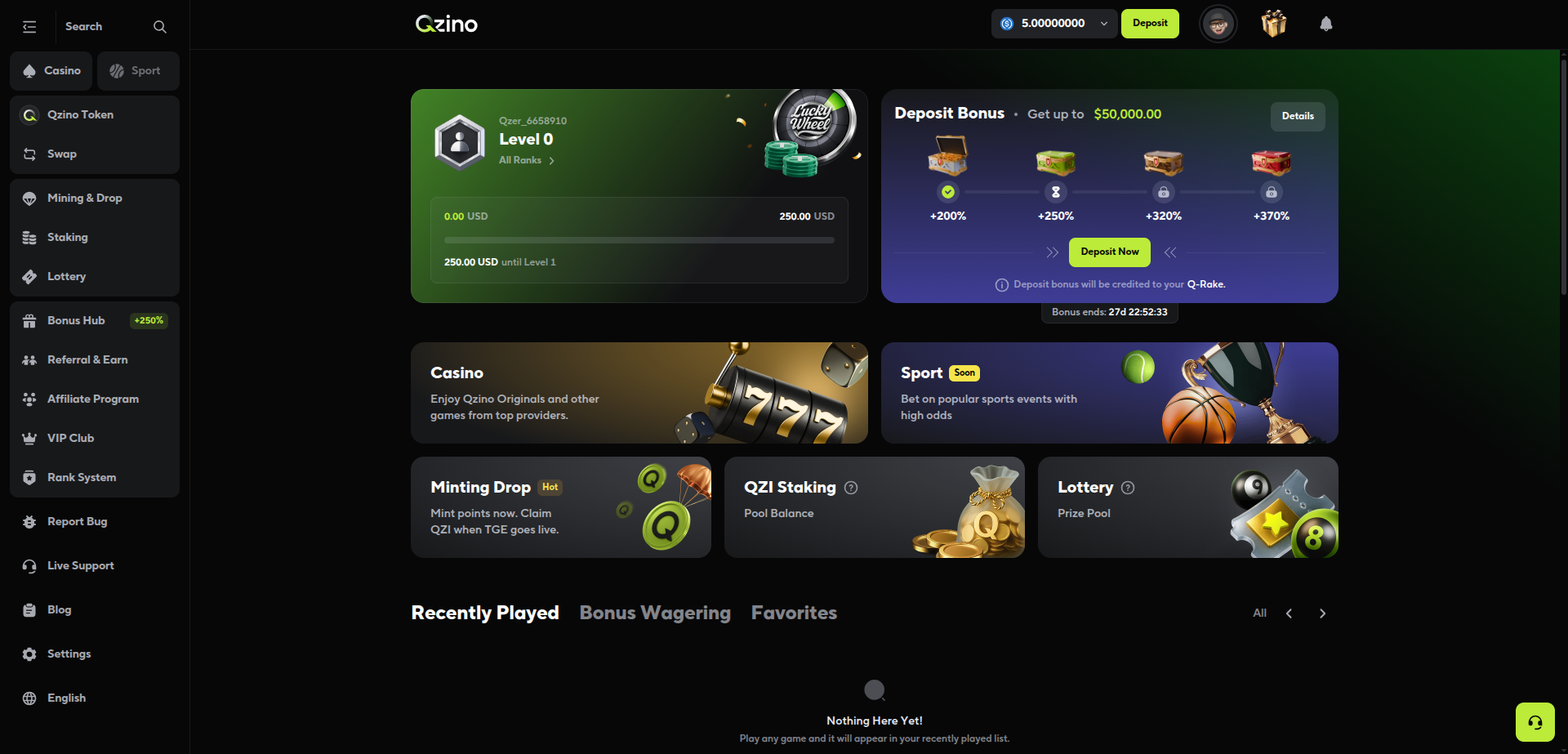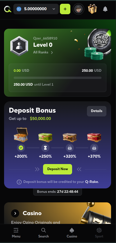 For your first deposit, you get: 200% match up to $25,000 with only $5 minimum deposit and no limit on how much you can win. Qzino uses something called a Q-Rake system. Long story short, you unlock the bonus progressively while wagering and playing on the website, and to unlock the full bonus amount, you'll need to wager 500x the deposit amount.