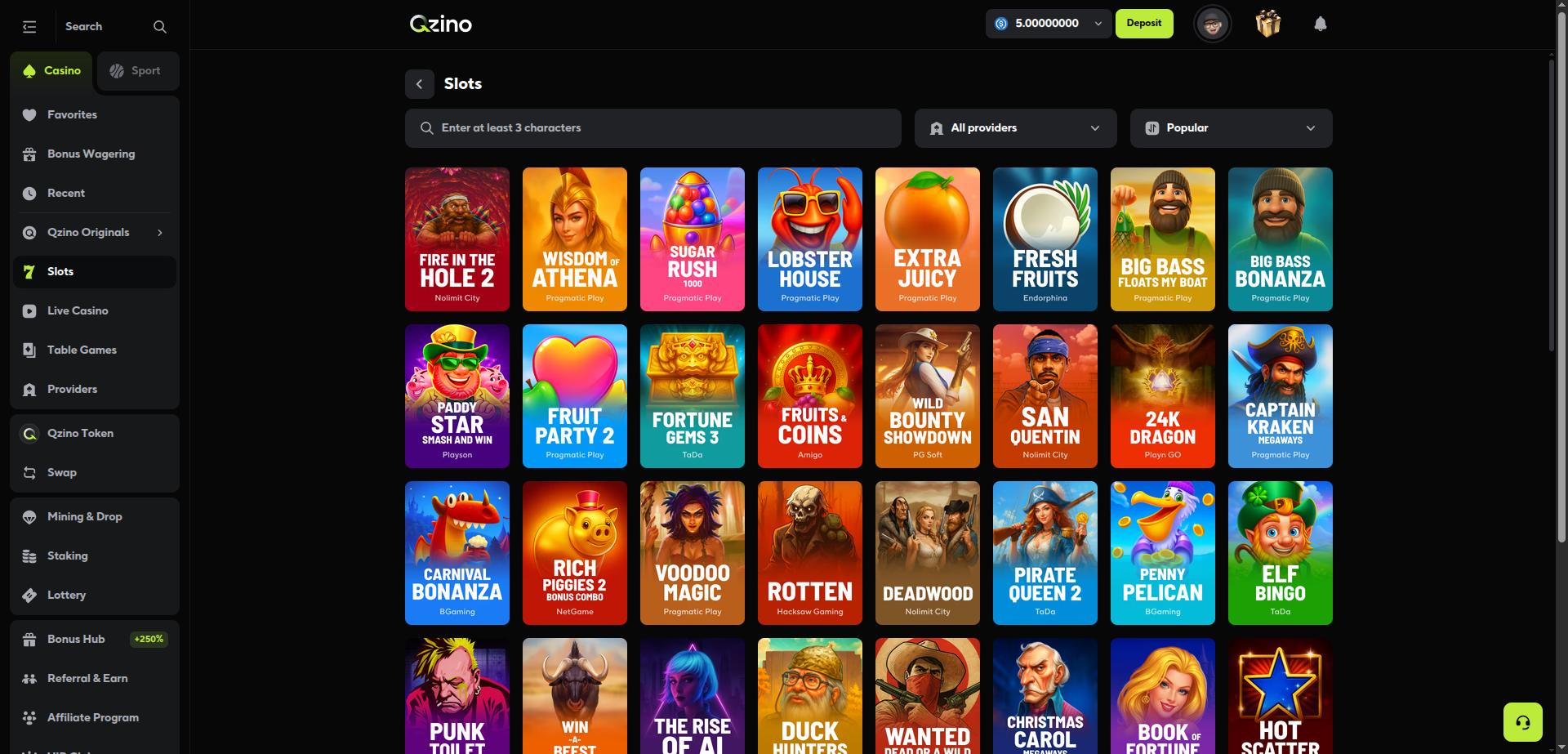 Qzino has around 1,000 games from 30+ providers, so you have an OK variety at your disposal. From Bitcoin slots and Crypto table games to live casino and provably fair games, you’ll find a bit of everything here. There’s enough variety to keep you entertained, and the library is always getting updated with new drops.